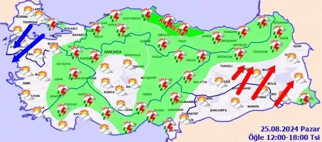 MGM, bugün İç Ege, Batı Akdeniz’in iç kesimleri, Doğu Akdeniz, İç Anadolu’nun kuzey ve doğusu, Karadeniz, Doğu Anadolu’nun kuzeyi ile İstanbul, Malatya ve Hakkari çevrelerinin yerel olmak üzere sağanak ve gök gürültülü sağanak yağışlı, diğer yerlerin az bulutlu ve açık geçeceğini bildirdi. Ayrıca Marmara’nın güneybatısı ile Kuzey Ege ve Doğu Anadolu’nun doğusu ile Güneydoğu Anadolu’nun doğusunda kuvvetli rüzgar bekleniyor.